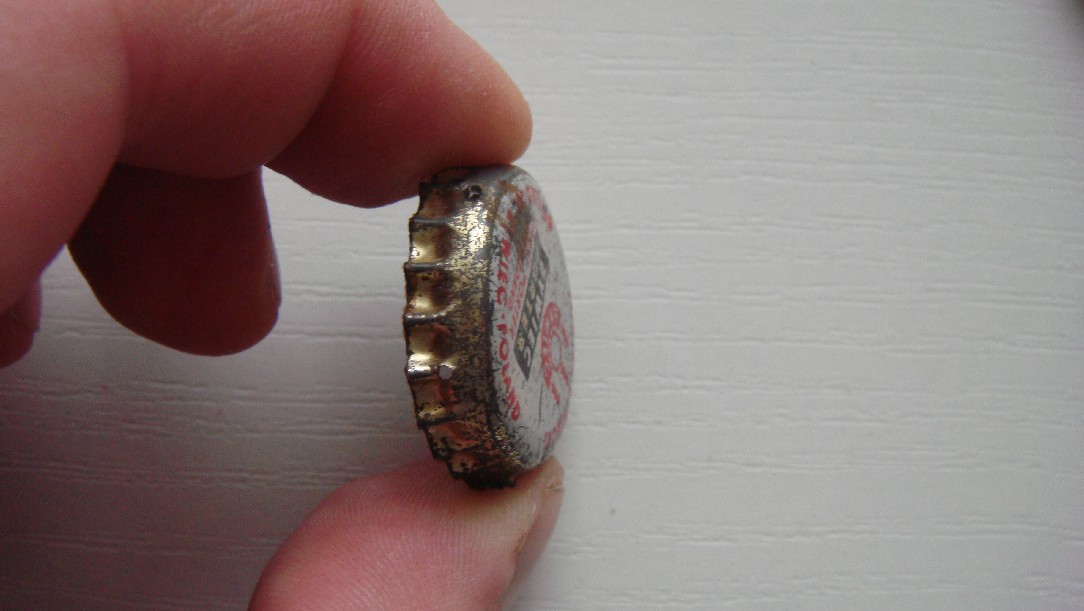 A było już na forum. Błąd w produkcji - zapomnieli zmienić kolor farby przy zmianie wzoru. I tak poszła bardzo krótka seria z czerwonymi ząbkami, część z nich pojawiła się na butelkach. Nawet mój kuzyn osobiście ściągał takiego z butelki.