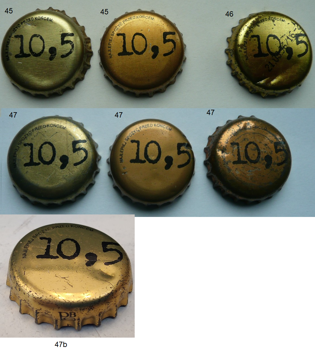 1) Tymczasem poddaję pod dyskusję kapsel Poznań 47b. Odmian 10,5 jest co niemiara. Stąd mam pomysł, aby usunąć dotychczasowy nr 46. Jak widać na załączonych zdjęciach 47b, który ma być analogiczną różnicą co 46 (chociaż chyba nie jest) jest tylko jedną z wariacji tego kapsla i jeśli mam nie tworzyć osobnych numerów dla wersji "miedzianych" to te bardziej błyszczące też nie powinny być dodane. Na zdjęciu są tylko ekstremalne przypadki, a na pewno są wersje pośrednie.