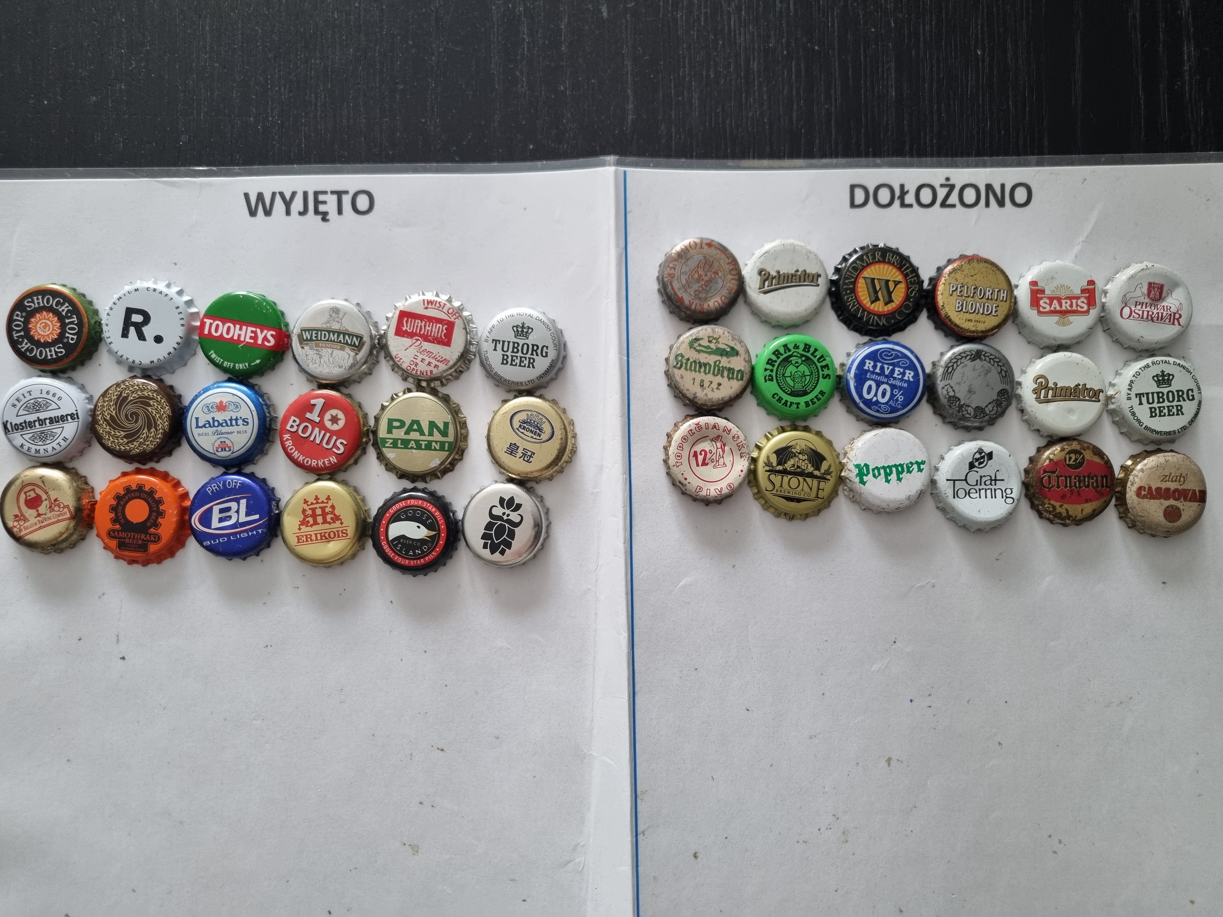 Poniżej przedstawiam zdjęcia tego co wyjąłem i dołożyłem do paczki. Jak już wcześniej pisałem, interesowały mnie tylko kapsle polskie piwne. W związku z tym w ogóle nie dotykałem zagranicy i kapsli innych. Na zdjęciach trochę pomieszałem standard i premium ale myślę, że wszystko jest jasne. Zdjęcia może trochę słabe ze względu na to, że robione przy sztucznym świetle.