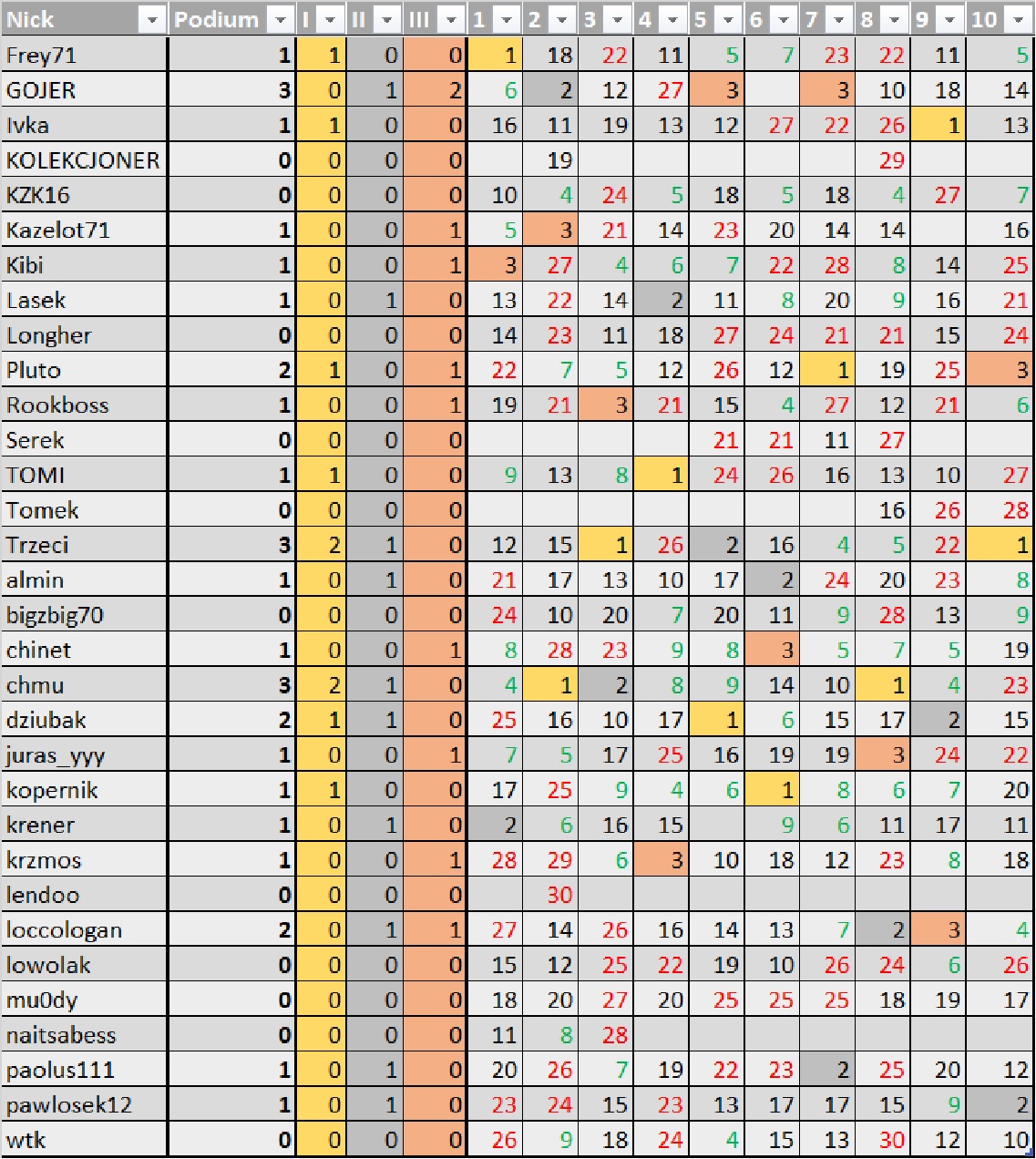 Żeby uprościć sobie zadanie stwierdziłem, że będę starał się co kolejkę pokazywać jakąś inną tabelę czy zestawienie. Co kilka kolejek będą się one powtarzały, tak żebyśmy mogli zobaczyć jak dane statystyki zmieniają się z czasem. Tym razem padło więc na zestawienie z miejscami Uczestników w poszczególnych kolejkach. Alfabetyczny układ z podziałem na nicki zaczynające się wielką literą i małą literą to zamysł Excela.