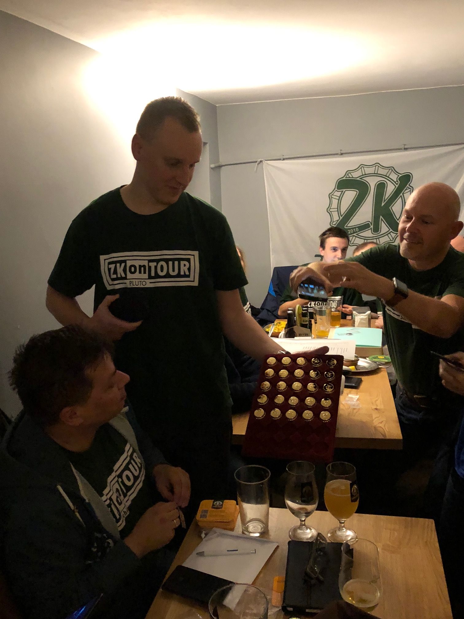 Wracając do głównego tematu, pierwszym szokiem była frekwencja. Nie sposób policzyć ile nas łącznie było bo jedni musieli wyjść przedwcześnie, inni pojawili się dopiero przed 19, ale z pewnością można napisać że było nas ponad 20 osób! I jestem przekonany że nikt z obecnych nie żałował spędzenia tego wieczoru w Chmielarni. Od początku pojawiły się nostalgiczne wątki. Kowalsik przyniósł swój zbiór pamiątkowych podstawek z których najwcześniejsza pochodziła z ZK #19 podczas gdy Dziubak miał niebywały rarytas w postaci podstawek z ZK#1 oraz ZK#3. Przypominaliśmy sobie spotkania które najbardziej zapadły nam w pamięć: domówki u Lolka, niechlubne Kartki w Złotym Ryżu na których byli jedynie Chinet i PGA (oraz Kamil Stoch w telewizorze, zdobywający złoty medal jakichś mistrzostw czy olimpiady) a także będące dotychczasowym rekordem frekwencji ZK #70 w Beerokracji. Ale skoro wspomniałem o pierwszym szoku, były też kolejne.