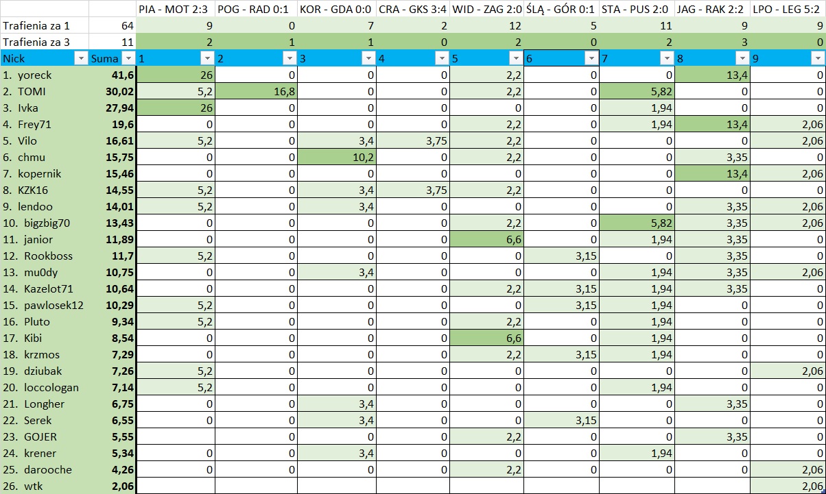 I jesteśmy już na bieżąco. 26 punktów za trafienie wyniku 2:3 w pierwszym spotkaniu robi wrażenie, podobnie jak wynik 40+ Jurka. No i zbliżamy się powoli do końca rundy, a tu 4 osoby w bezpośredniej walce o tytuł.