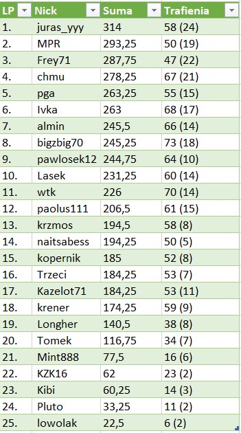 Gwoli ścisłości, w klasyfikacji generalnej Kazelot71 powinien być przed Trzecim. Jednak w związku z tym, że sprawa tyczy się miejsc z drugiej dziesiątki, a mi zależało na opublikowaniu wyników w ten weekend, nie poprawiałem już tego. W przyszłości oczywiście kryteria sortowania wyników zostaną poprawione.