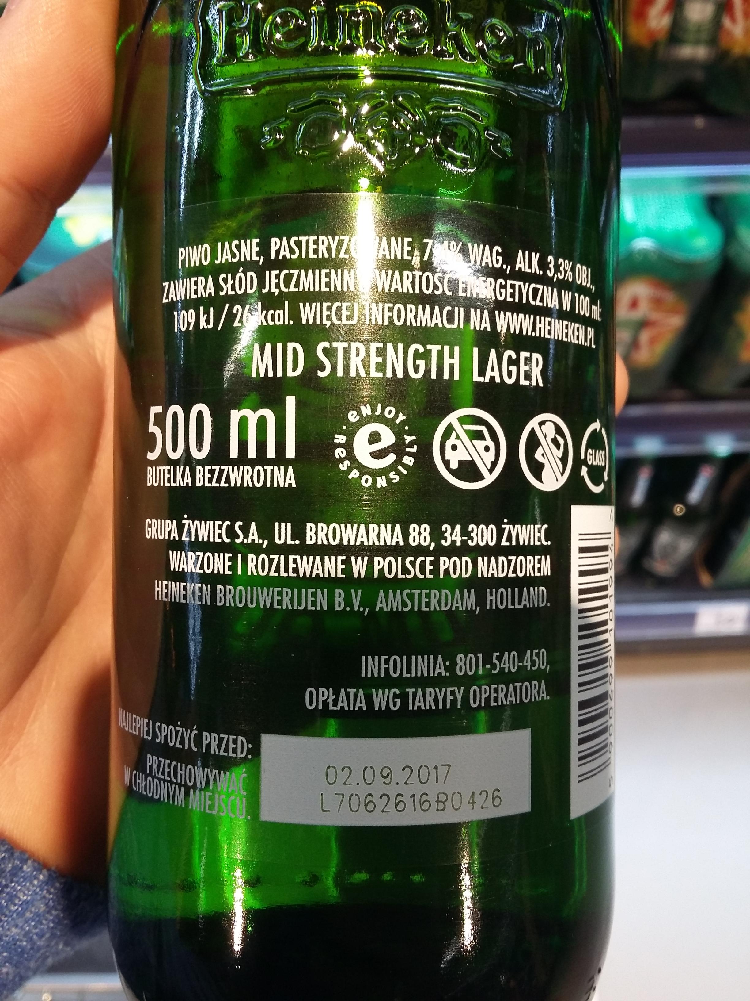 Miał etykietę rozano w browarze w Żywcu na licencji Heinekena. Zdjęcie etykiety wstawię jutro bo będę w tym sklepie. A butelkę wywaliłem .