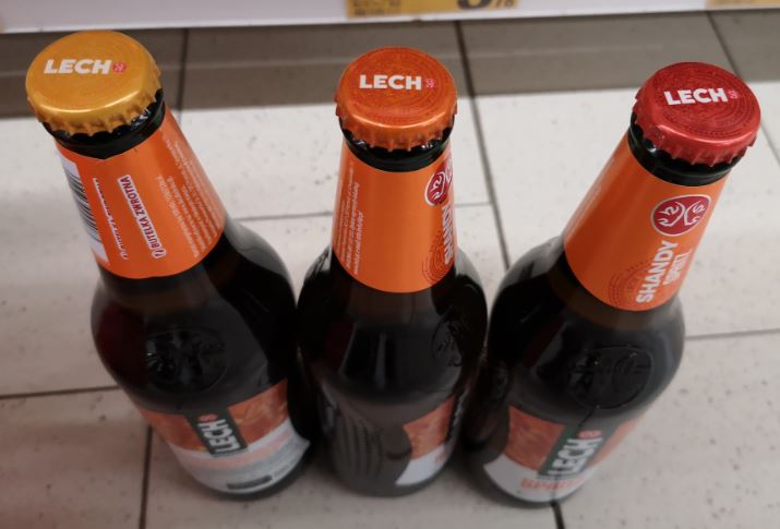 Jest i 3ci odcień Lecha Shandy Spritz! Wszystkie na jednej półce. Loteria już z tymi Lechami, każdy kapsel inny tak naprawdę... Postulowałbym za usunięciem tego pomarańczowego z poczekalni, bo znając życie będą się pojawiać i następne warianty, a to droga ku zatraceniu. W jego miejsce wstawiłbym Lecha Free Granat Acai (promocyjnego lub niepromocyjnego, w zależności od tego który z nich już jest w katalogu). Niepromocyjny z białą uszczelką znów pojawił się w sklepach. Teraz gdy mam obie wersje, różnica jest widoczna gołym okiem. Również uszczelki to potwierdzają.