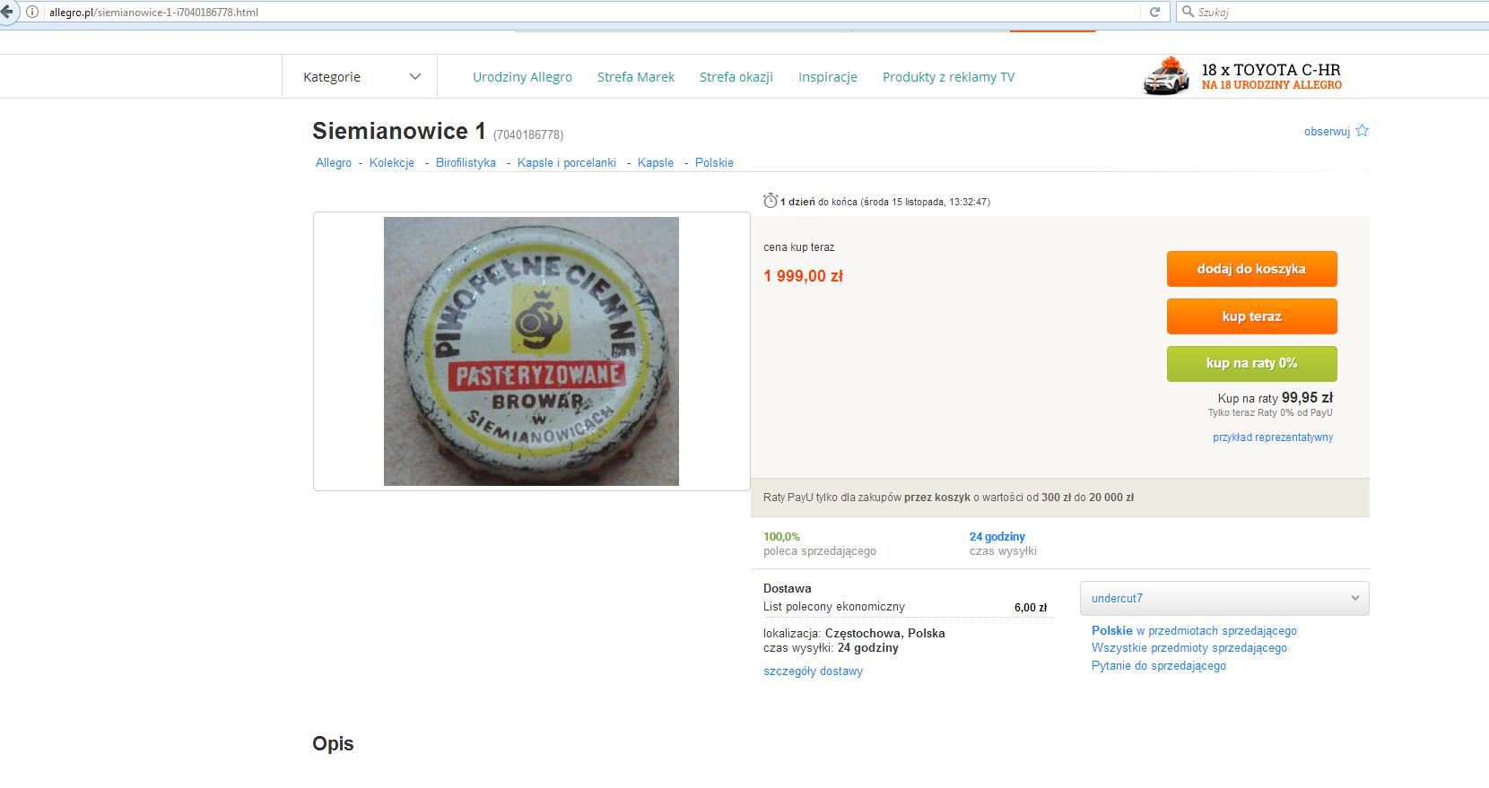 Aukcja się skończyła 28.04 Ostrów Wlkp nr 13 cena za kapsel 800,00 zł