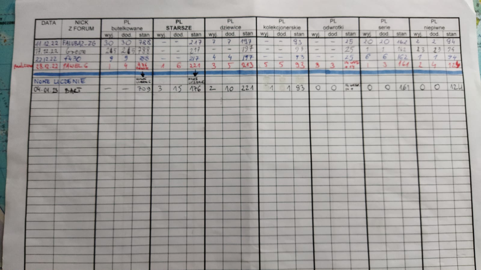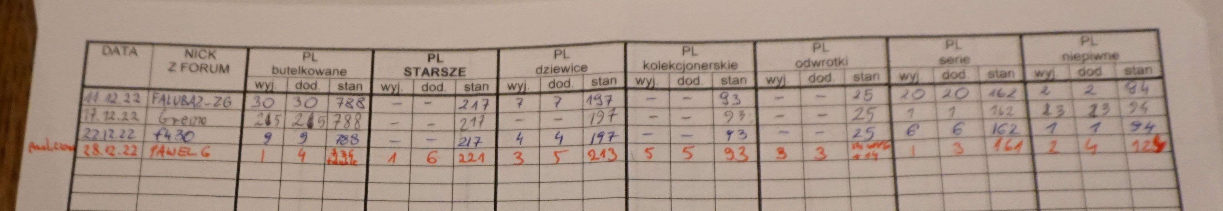 Paka dziś do mnie dotarła. A nawet zdążyłem już ogarnąć polskie. Wszystkie przeliczyłem i skorygowałem różnice w zapiskach. Żadna polska kategoria nie zgadzała się na kartce co do sztuki. Niepiwnych i dziewic jest dużo więcej niż było zapisane. Polskich butelkowanych za to sporo mniej, ale do tego osobno są duble, które być może też były wliczone, wtedy też byłoby więcej niż na kartce (ja je w rachunku pominąłem). W pozostałych kategoriach mikro odchyły. Dwa niepiwne z polskich przerzucam do zagranicznych.
