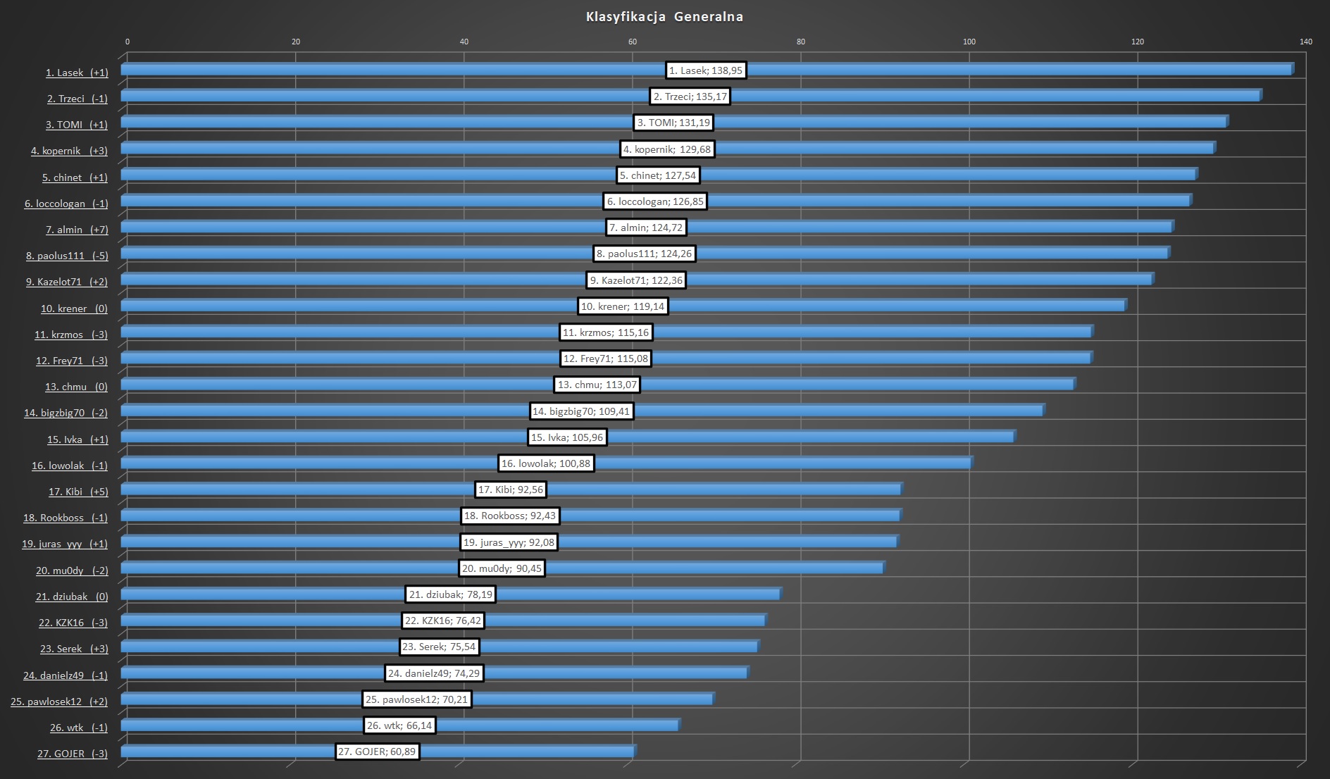 Znowu odpłynąłem... Przewaga almina była wyraźna, dalej w tabeli mamy wspomnianego Kazelota71, a także kopernika oraz Kibiego. Ten ostatni, wraz z mu0dym zaliczają się do największych pechowców kolejki: przepiękne trafienie Lukasa Podolskiego z rzutu wolnego z końcówki meczu Górnik - Wisła Płock kosztowało ich dobre kilkanaście oczek. W klasyfikacji generalnej mamy zmianę na pozycji lidera: Lasek przeskakuje Trzeciego. Na trzecim miejscu TOMI. Dobry wynik daje awans do czołowej dziesiątki alminowi, wypadają z niej natomiast krzmos oraz Frey71 - obaj znajdują się o 3 pozycje niżej niż przed tygodniem.