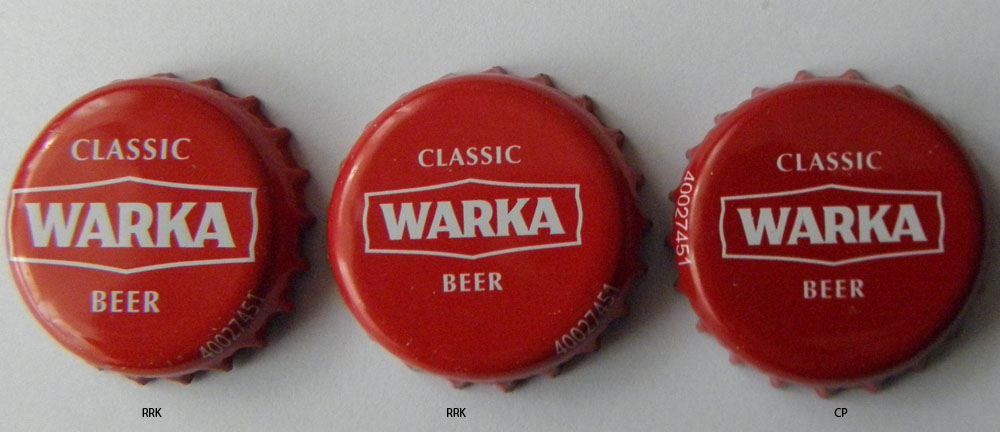 Pierwszy kapsel od lewej powiększone logo WARKA w stosunku do panującej wersji ,,standart" - okazuje się ciekawostką, gdyż następny kapsel jakby już w wersji ,,standart" lecz pomniejszone logo WARKA w stosunku do poprzedniej wersji i jaśniejszy kolor czerwieni od panującej. Firma firmie nie jest równa odcienie między rrk a cp zawsze były i będą w kolorystyce barw. Nadmieniam że jest to mój pierwszy post, i mam jeszcze mało wiedzy, ale uważam że Warka 135 jest błędem - powiększenia loga Warki - następnie wrócili do wielkości ,,standartowej" obecnie przyjętej, lecz jaśniejsze tło ( nadal) eliminuje ten kapsel do dalszej produkcji - liczy się jakość kolorystyki. Obecnie trudno dostać - spotkać ten kapsel na butelce. Pozdrawiam