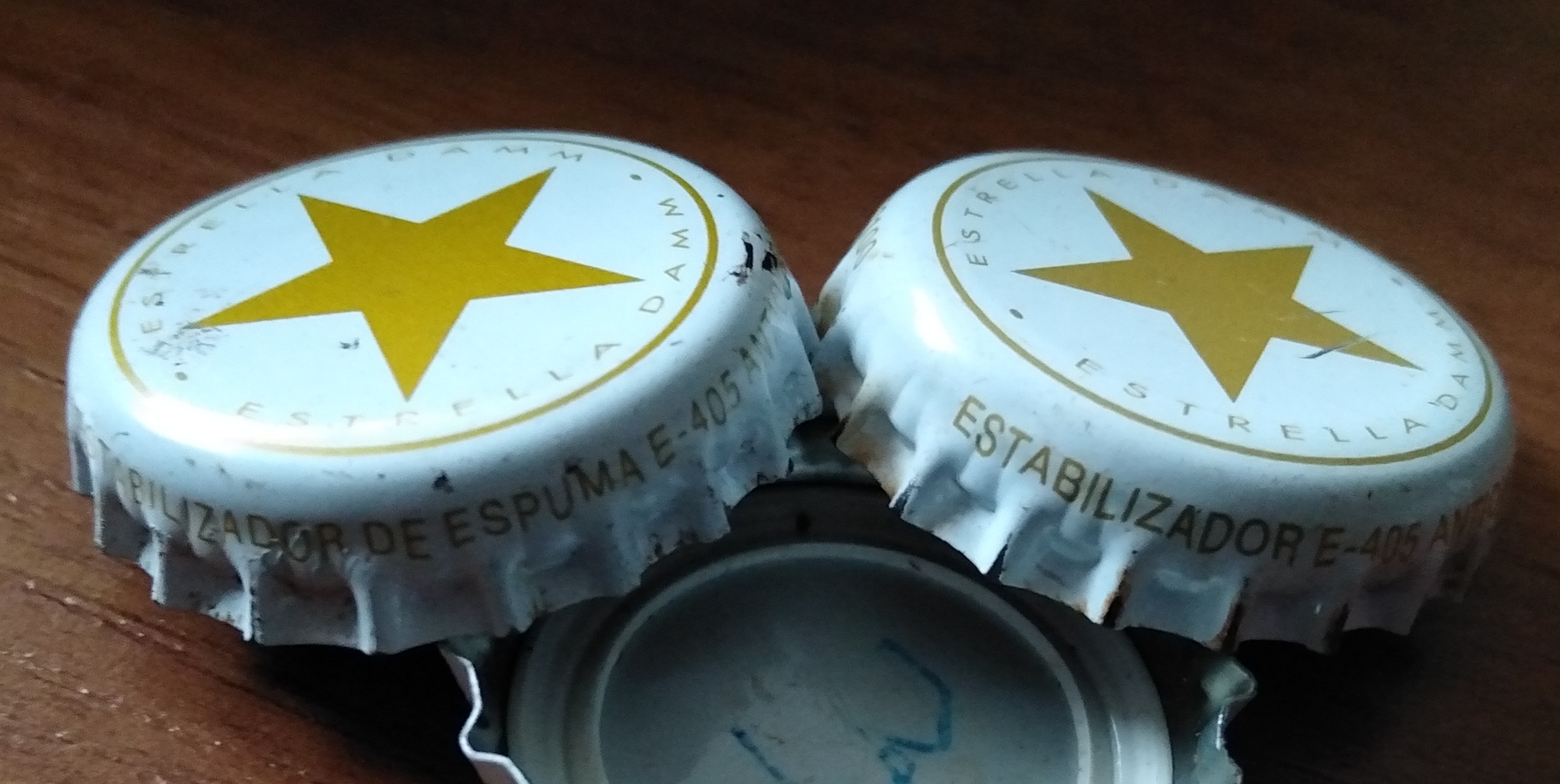 Różnice dla tych, dla których znaczenie mają także napisy na ząbkach kapsla. Browar DAMM z Barcelony umieszczal tam substancje stabilizujace które raz miały formę ESTABILIZADOR DE ESPUMA E-405 a innym razem ESTABILIZADOR E-405. Da się zauważyć różny odcień samych gwiazdek ale tu nie jestem pewien czy tak było pierwotnie, czy różnica powstała z różnych warunkow przechowywania
