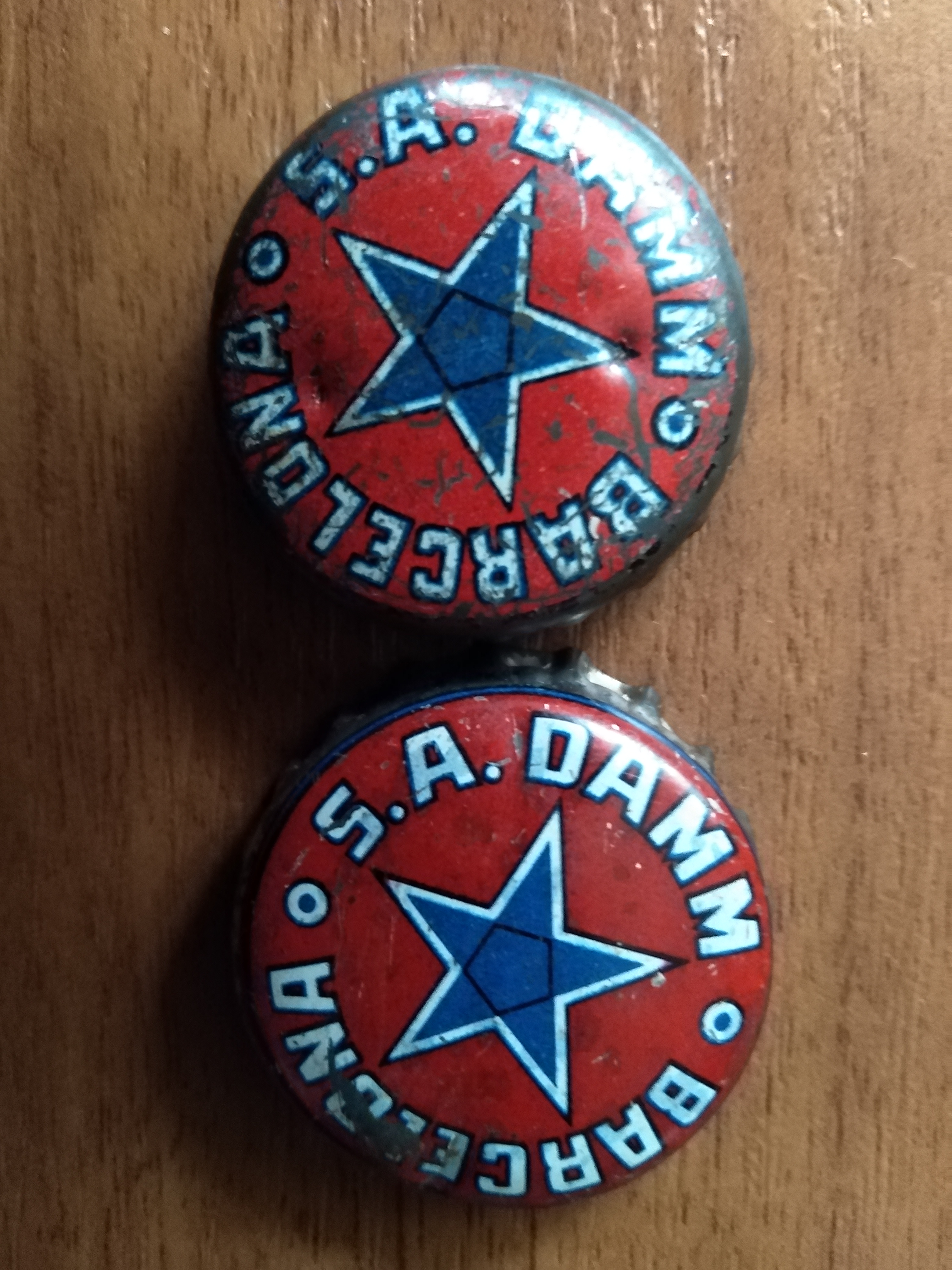 Ten sam browar i dwa starsze kapsle. Na jednym kapslu szerszy napis DAMM co dobrze widać po położeniu szpicu ramienia gwiazdy. Raz jest w połowie litery M a raz na jej końcu.