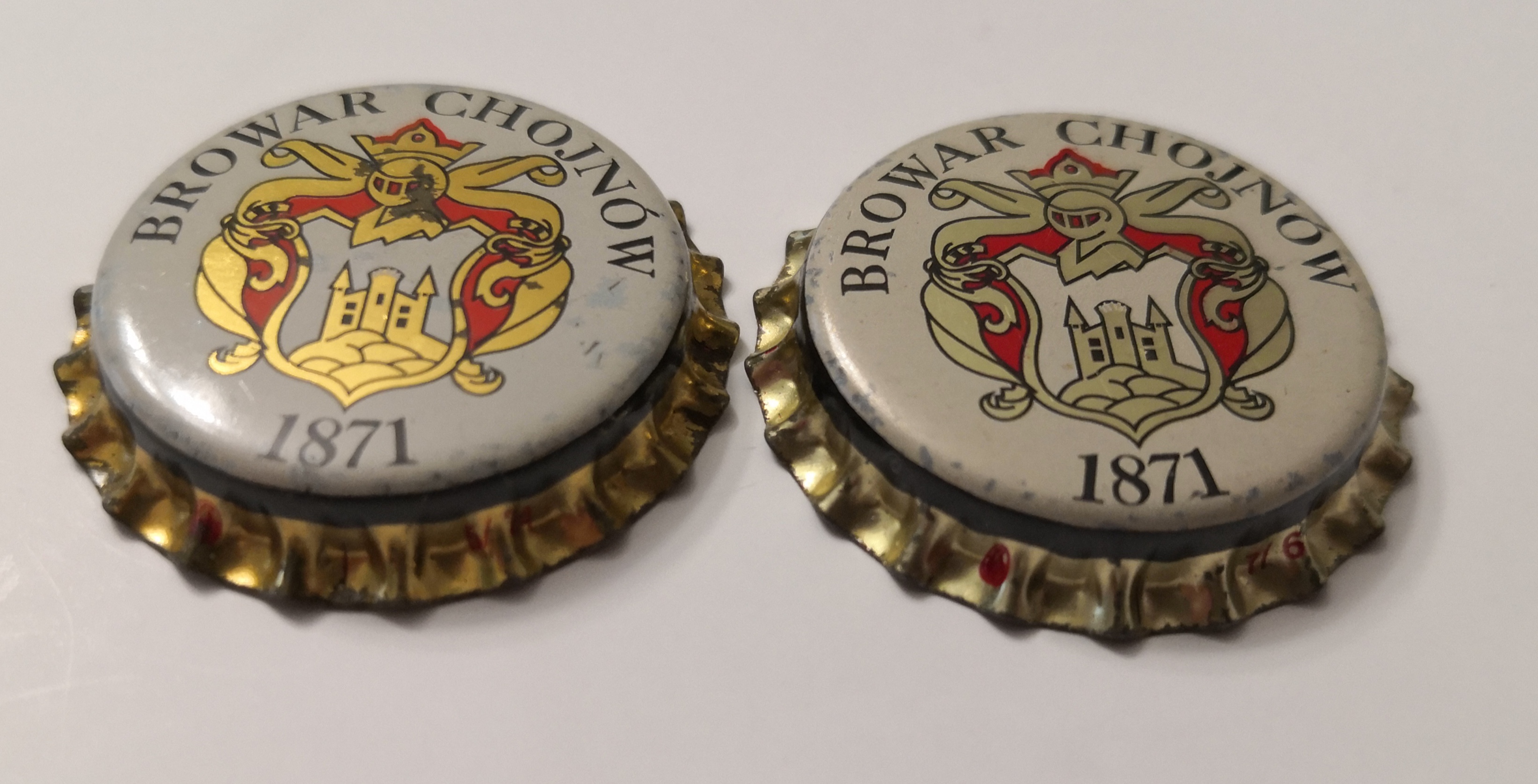 Wrocław Piast nr 64 różne odcienie (na żywo jest większa różnica w odcieniu). Z lewej jest bardziej żółty, prawy wpada w złoty odcień. Ten kapsel z prawej ma na odwrocie kod.
