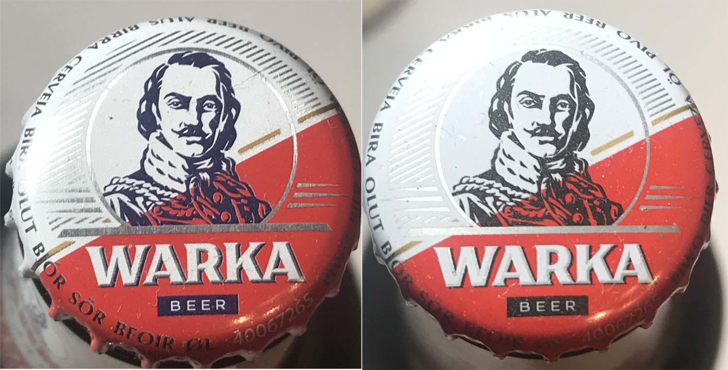 Nie wiem czy zauważyliście, ale dwa kapsle Warki Jasne Pełne z poczekalni różnią się nieco pomiędzy sobą. Ten z sygnaturą CP na II ma postać i prostokąt na dole w kolorze czarnym, zaś z sygnaturą RRK na IX w kolorze granatowym.
