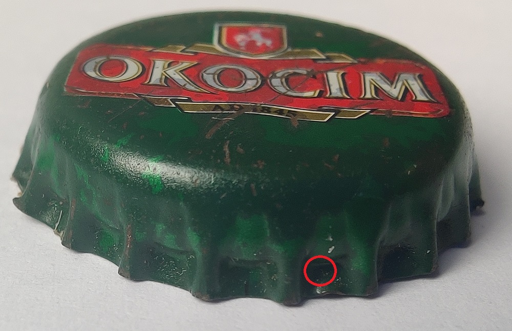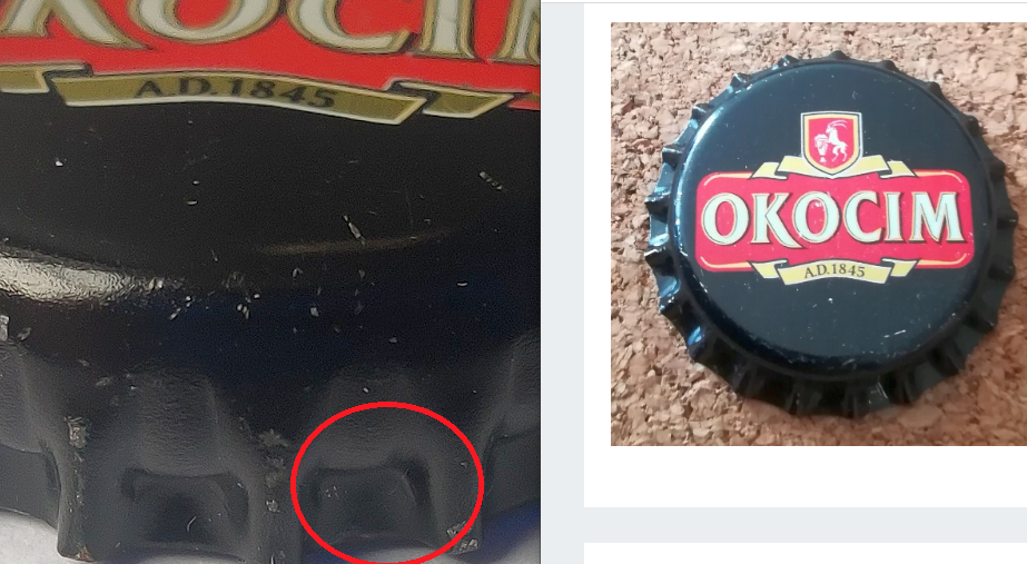 Przedstawione przez PawłaG rzekome miejsca gdzie miała być sygnaturą, nie przekonują mnie. W przypadku czarnego kapsla, zaznaczony cień jest taki sam jak na ząbku obok. Oba kapsle mam przed sobą, na żywo i nie widzę tam cienia sygnatury.