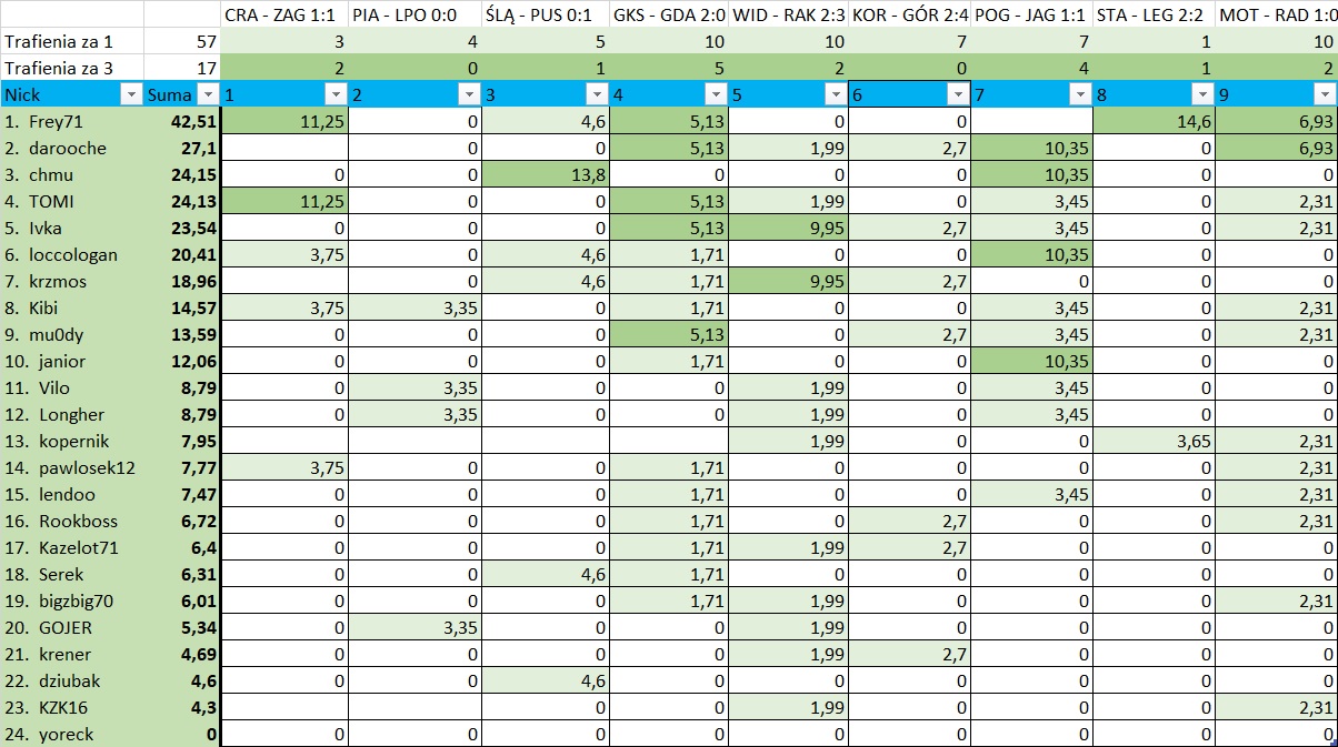 Słodko-gorzka kolejka dla Freya71. Zdecydowanie wygrał w tej serii spotkań, umocnił się w czubie tabeli, jednak przez swój błąd wyrzucił ponad 10 punktów. Przekroczenie limitu wyników (1:1, a jakżeby inaczej) i pech, bo czwarte okazało się poprawne wskazanie rezultatu w Szczecinie. Czy te brakujące punkty zaważą? Zobaczymy... :)
