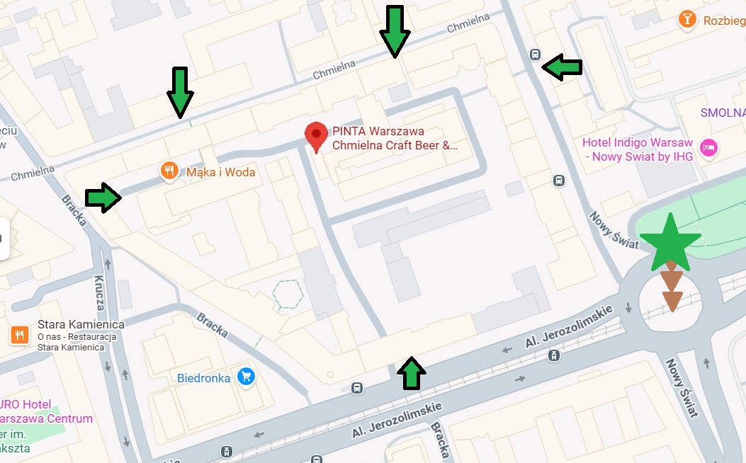 Dla tych, którzy jeszcze nie byli w Pincie: lokal nie mieści się przy ulicy Chmielnej, ale w podwórku. Wchodzi się przez bramę, jak widać na załączonym obrazku, z dowolnej strony.